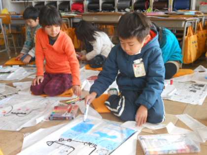 高く上げたときにもはっきり絵が見えるように、大きくかいて、ていねいに色をぬりました。