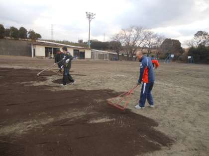昨日のグラウンド凍結後のぬかるみで荒れてしまったグラウンドを、子どもたちが使えるように…と、先生方が整備していました。