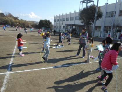 たくさんの子どもたちが、グラウンドに出て縄跳び運動に取り組みました。