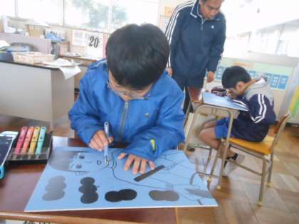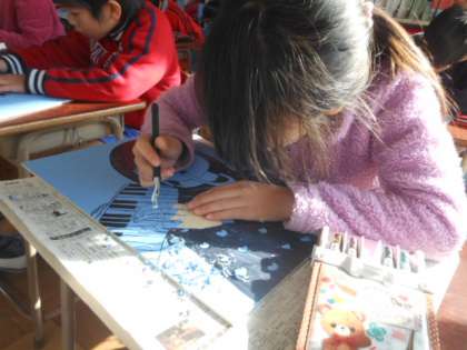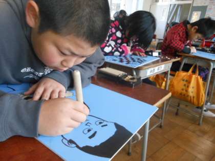 版画の「楽器をひく自分」の下がきが完成し、いよいよ彫りに入っています。線や面に合わせて、いろいろな彫刻刀を使いながら、集中して彫り込んでいます。