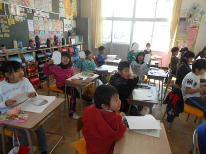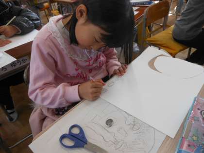まず、最初に顔の輪かくを作りました。自分の顔の大きさとくらべました。その後、目→まゆ→鼻→口の順番で部品を作りました。