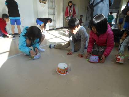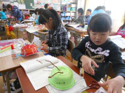 国語の「ゴムでうごくおもちゃのしくみ」では、教科書の文から、作り方を読み取り、読み取ったことを、実際に作ってためしてみました。ねじれたゴムがもとにもどる力を使って動くおもちゃにびっくり!動き方がとてもおもしろかったね。