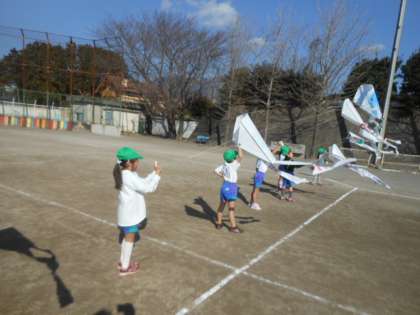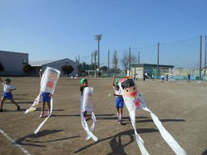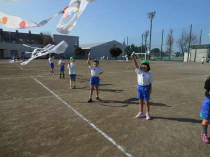 運動場に出て凧揚げの準備ができた頃には、ほどよい風も吹いてきて、子どもたちを応援してくれました。凧が揚がると、「わあ。」と歓声が上がっていました。