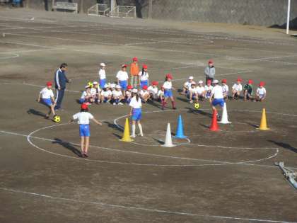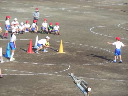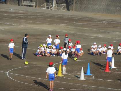 サッカーの学習を進める始めとして、攻撃側に有利なゲームである「ウルトラシュートゲーム」を行いました。子どもたちは、得点を決める楽しさを感じることができました。
