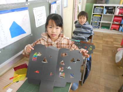 台紙をカッターで切りぬいてから、カラーシートをはりつけました。