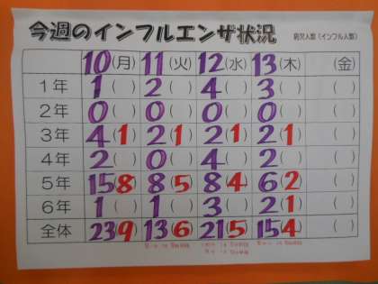 5年生の欠席者は減ってきましたが、6年生にインフルエンザ罹患者が出たのが気になります。この子も含め、20日(木)の卒業式に、6年生134名全員が参加できることを願っています。