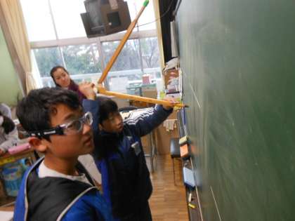 分度器を使わずに、教科書にのっているものと同じ角をかいてみました。どのようにかけばよいのか、自分の考えたかき方を前に出て紹介してもらいました。やってみて、あれ?ちがうぞ?など気づくことも多く、しっかり考えることのできた時間でした。