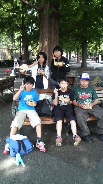 上野公園の中でお弁当を食べています。外で食べるお弁当は美味しいですね。
