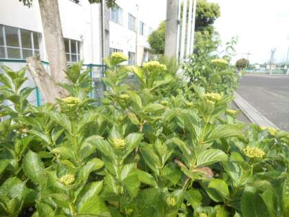 愛鷹小学校グラウンド脇のアジサイも、つぼみをつけました。