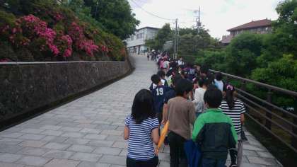 泉水源地での見学を終えました。バスに向かいます。お弁当です。
