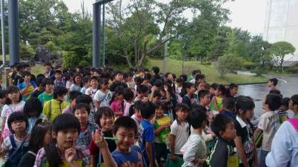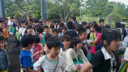 浄化センターの見学を終え、外に集合です。最後に質問をしています。