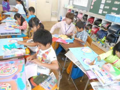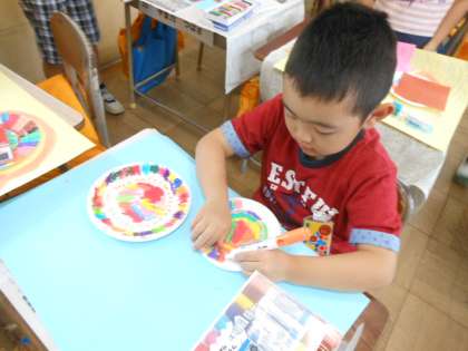すきな いろの がようしを えらんで、まえの じかんに つくった かたつむりの から(かみざら)を はりました。