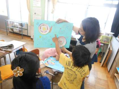 その がようしに かたつむりの あたまや あじさいの はな、あめのけしき などを、おもい おもいに たのしく かきました。