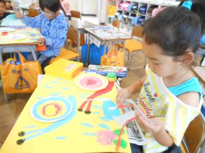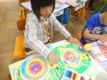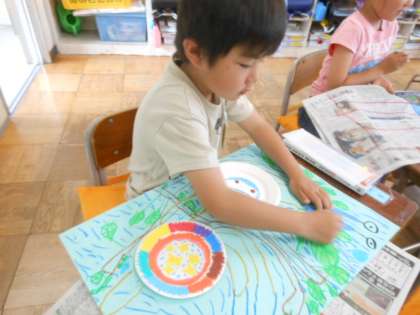 かたつむりが たのしく さんぽしている ようすを かきました。
