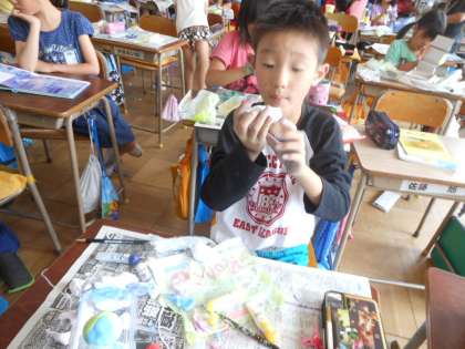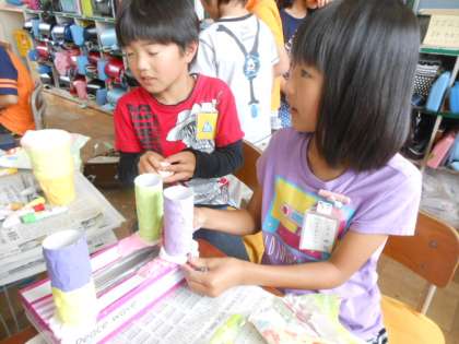 紙粘土を箱や缶、ペットボトルなどにつけて、生活で使えるものを作りました。