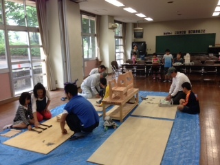 子どもたちは家の人と一緒に、講師の先生から手ほどきを受けながら、頑張ってマガジンラックや椅子を作りました。