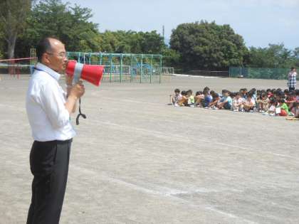 前半の緊急避難訓練は、校内での避難経路を確認しました。移動の際、『お』…おさない、『か』…かけない、『し』…しゃべらない、『も』…もどらない の約束を意識して行い、避難開始から6分で避難・人員確認が完了しました。