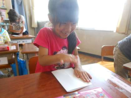 ての かんしょくが あさがおに あったのか、きれいな あさがおの たたきぞめが できました。