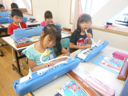 先生が弾いた音をよく聴いて、同じ音を鍵盤ハーモニカで弾くことに挑戦しました。