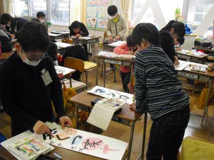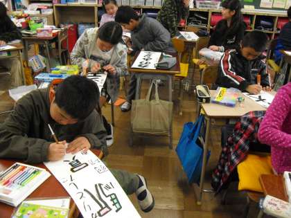 自分の夢を思い浮かべ、毛筆で書きました。今日は、みんな、わくわくした思いで、楽しく文字かざりをつけました。10才記念式で、壁に掲示するので、楽しみにしていてください。