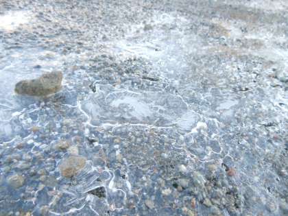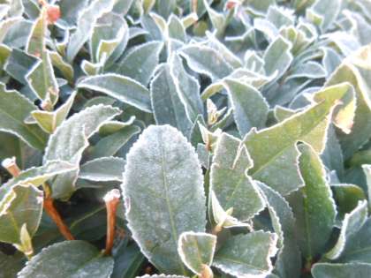 厳しい冷え込みで、霜柱が立ったり、お茶の葉に霜が降りたり、グラウンドの水たまりに氷が張ったりしました。