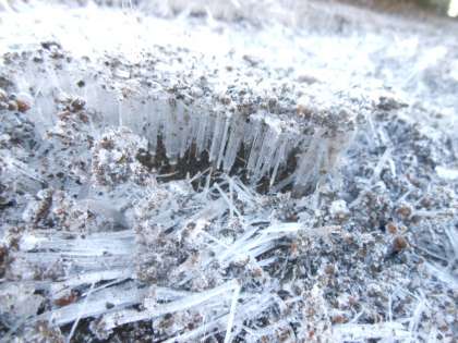 厳しい冷え込みで、霜柱が立ったり、お茶の葉に霜が降りたり、グラウンドの水たまりに氷が張ったりしました。