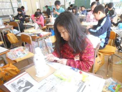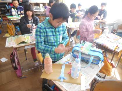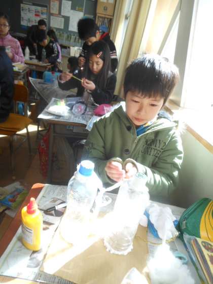 ペットボトルに紙粘土をつけて、建物や動物など思い思いのものを作っています。