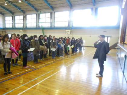 最初に体育館で全体会が行われました。その後、新支部長・体育部員の方たちは、会議室で研修会に参加しました。子どもたちは、体育館でリーダー講習会に参加しました。