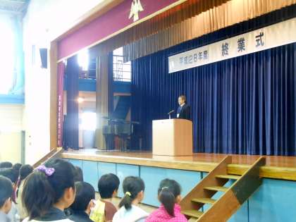 体育館で終業式が行われました。1年生と6年生の代表児童が、2学期の振り返りと、3学期への希望を語りました。運動会のダンスの練習をがんばったこと、生活科で楽しんだこと、修学旅行で自ら役割を担ったことなどが紹介され、フロアーの子供たちもよく聞いていました。