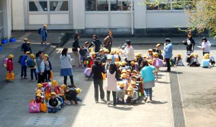 しばらく1年生は、集団下校します。まず、コース別に玄関前に集合。その後、先生の合図で出発します。