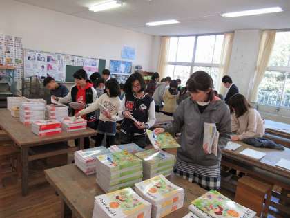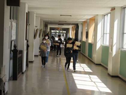 たくさんの配布物を袋に詰めて、教室に運びました。