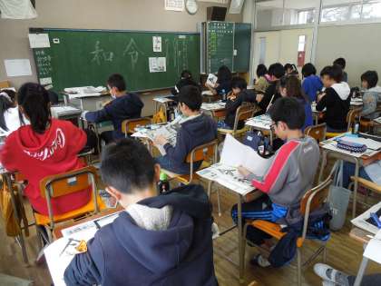 書写の時間に毛筆で新元号の「令和」の練習をしました。時代の移り変わりを感じます。