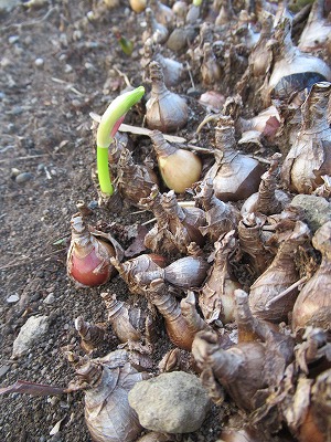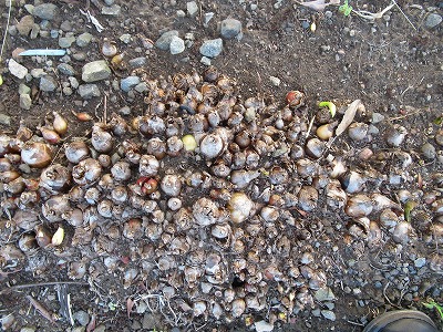 愛鷹小東側の道路脇に、球根のようなものが密集してあります。