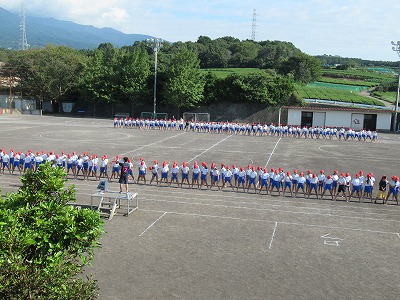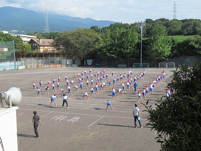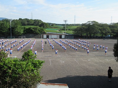 ラジオ体操をしっかりと行った後、表現の3段ピラミッドへの隊形変化とその練習に取り組みました。