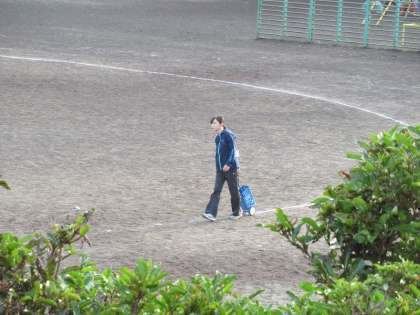 先生が運動場にラインを引いていました。