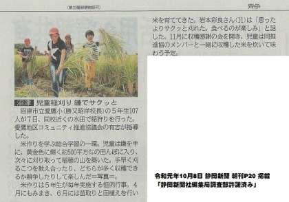 5年生の稲刈り体験が静岡新聞に掲載されました。 【愛鷹小】