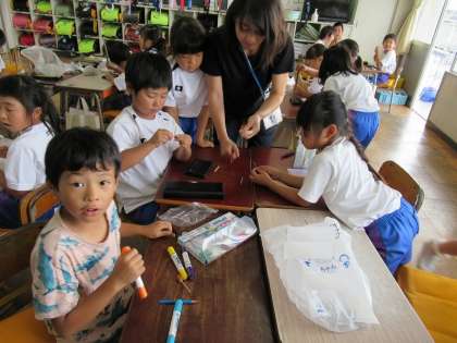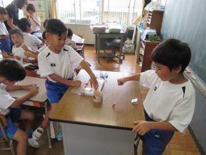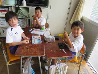 秋みつけで拾ってきたドングリにキリで穴を開けてつまようじをさして、ドングリごまを作りました。
