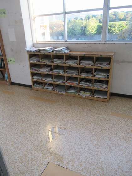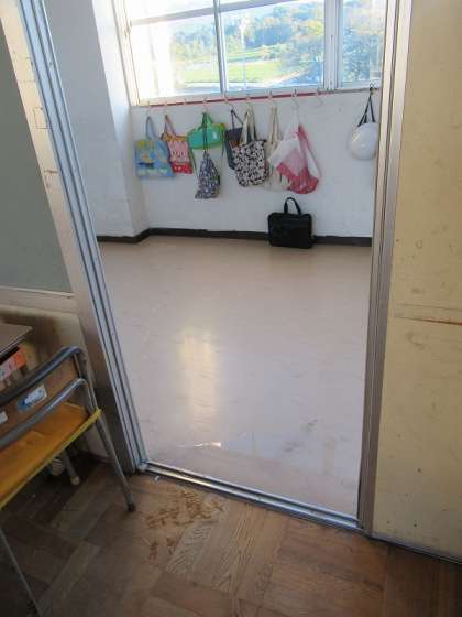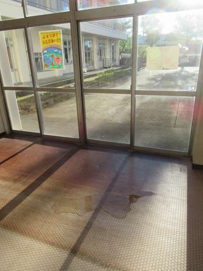校舎内には、強風で窓のサッシの隙間から流れ込んだ雨水が数カ所見られました。