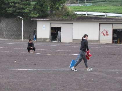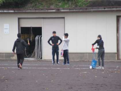 先生方は、朝運動(ドッチボールラリー)のラインを引いていました。