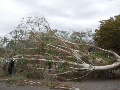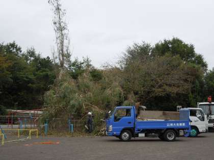 台風19号で倒れてしまったユーカリの木を、業者の方が片付けに来て下さいました。とても大きな木なので、4人がかりで作業して下さっています。