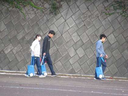 先生方は、雨で消えてしまったラインを引き直していました。