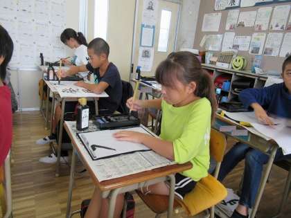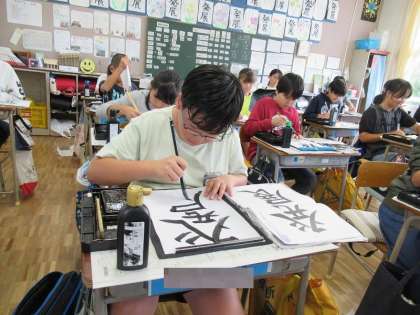 毛筆で『発展』の練習をしました。