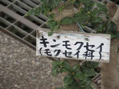 学校東側の桜の木の間のキンモクセイが、花を咲かせていました。