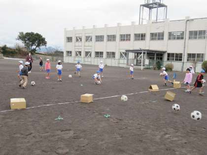 笛の合図で一斉に段ボールめがけてボールを蹴り込みました。