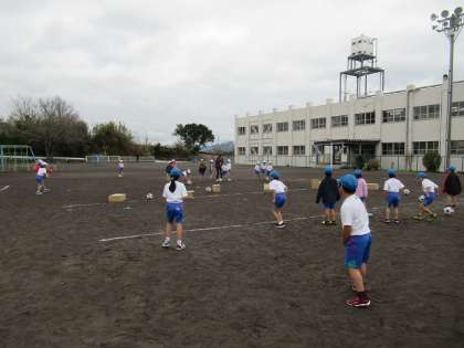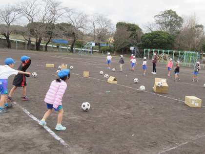 笛の合図で一斉に段ボールめがけてボールを蹴り込みました。