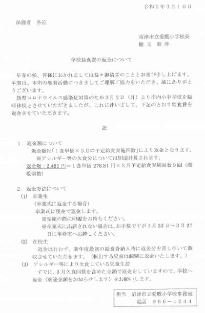学校給食費の返金について (3/11〜13の荷物引き取りの際に文書を配布します。)