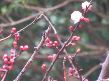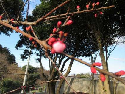 見〜つけた 『鷹の子森の紅梅、咲き始めました。』