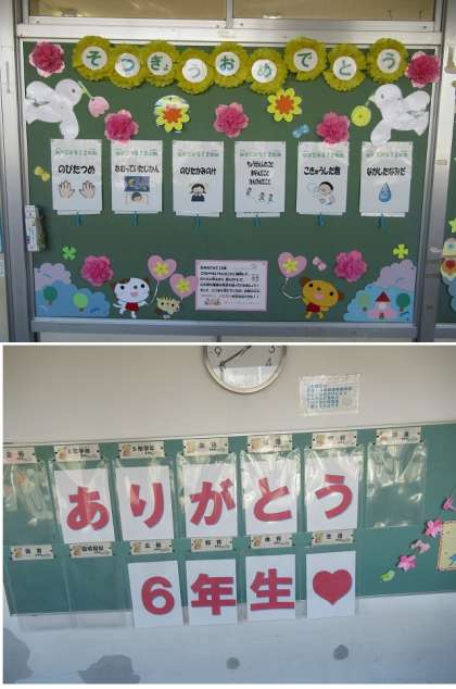 北校舎2階の保健室の前には保健の先生からのメッセージが、放送室前には「ありがとう 6年生」のメッセージが飾られていました。