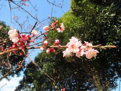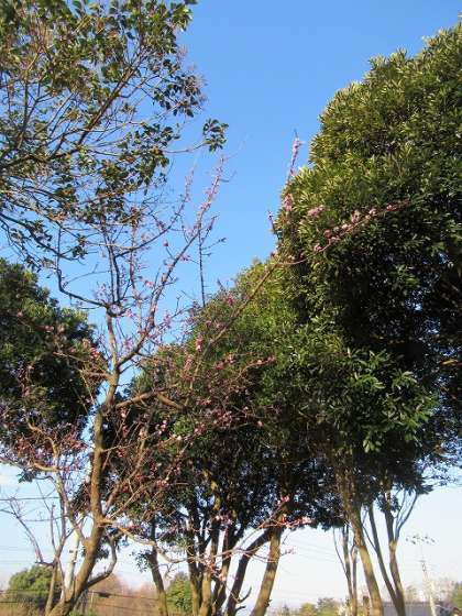 鷹の子森の紅梅の開花は、2〜3分咲きまで進んでいました。