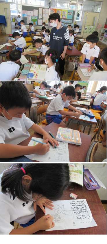 「季節のたより」で、自分が見つけた秋らしいことつにいて言葉や絵で、プリントに表現しました。